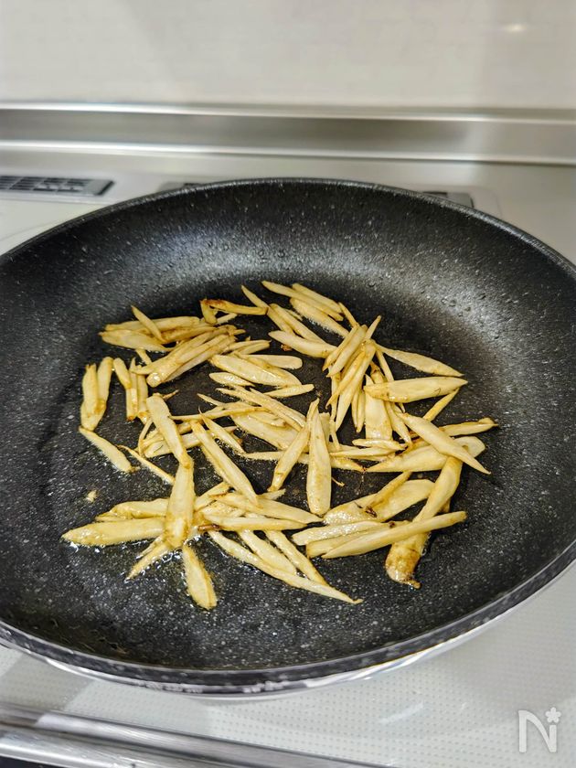 (2) フライパンに米油を入れ中火で熱し、水けを切ったごぼうを3分炒める。