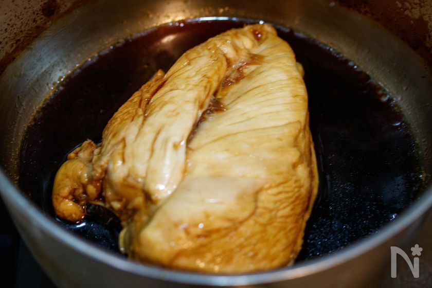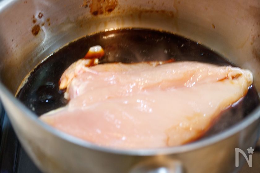 (1) 鶏むね肉がすっぽり入るくらいの鍋に【A】を入れ、中火にかける。沸騰したら鶏肉の皮目を下にして入れ4分煮、裏返してさらに4分煮る。