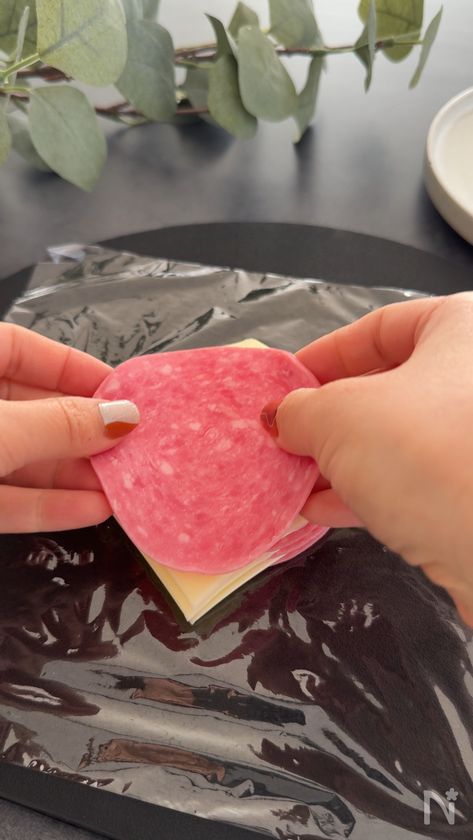(1) スライスチーズと味付きのり、スライスハムを交互に重ねる