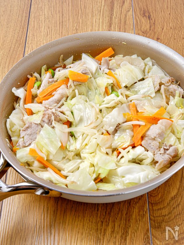 (4) キャベツ、もやし、枝豆を加えしんなりとするまで炒める。