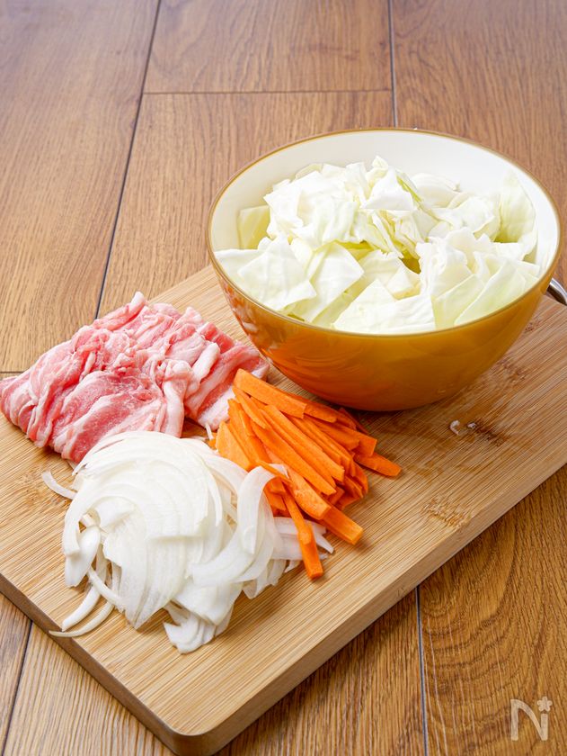 キャベツはざく切り、玉ねぎはスライス、人参は細めの短冊切りにする。
