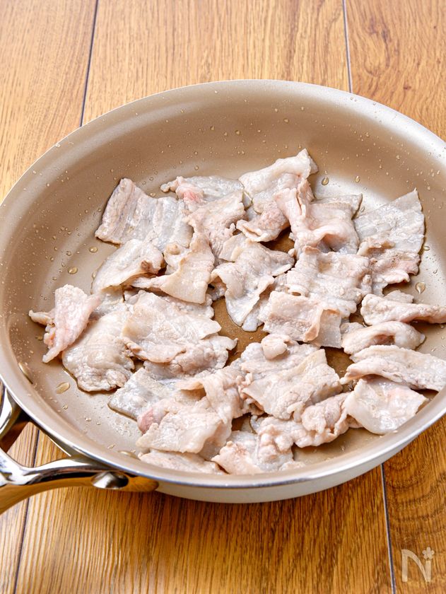 (2) フライパンにごま油を中火で熱し、豚肉を加えある程度火が通るまで炒める。