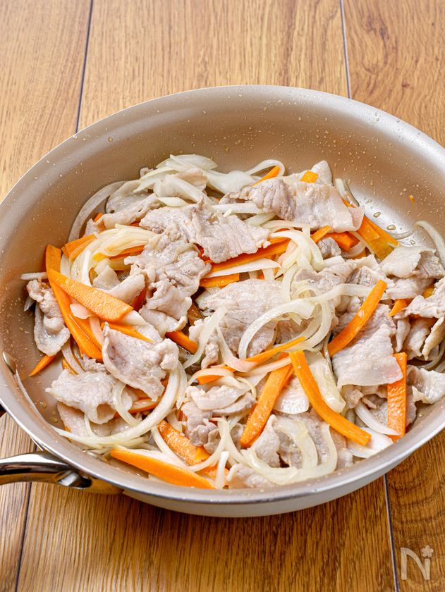 (3) 玉ねぎ、人参も加えて炒め、馴染ませる。