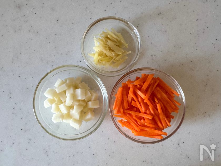(3) 切り餅は7mm角程度の大きさに切る。にんじんは細切り、しょうがは千切りにする。