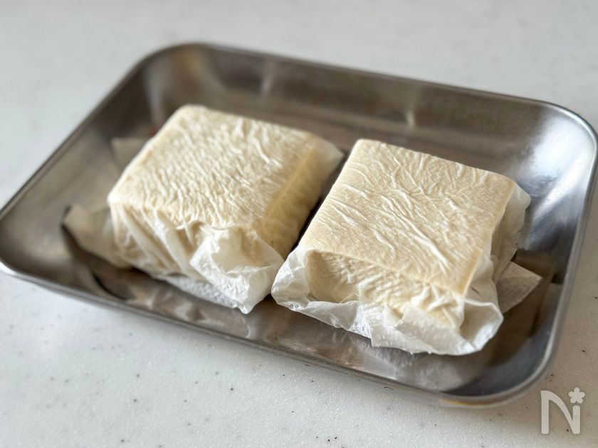 ・タカノフーズ「おかめ豆腐 もめんミニ3」は必ず水切りしてください。重石をのせる必要はありません。