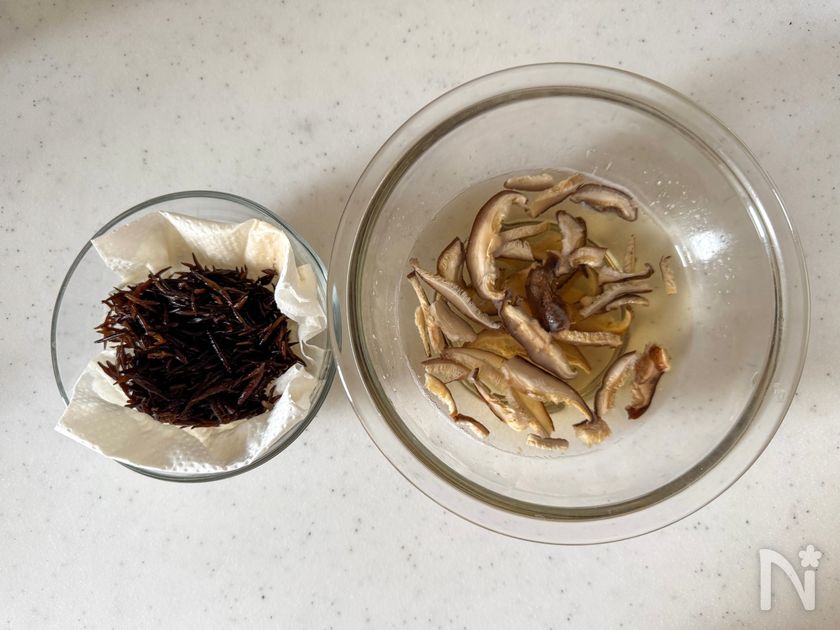 (2) 干ししいたけ、芽ひじき(乾燥)はそれぞれ耐熱ボウルに入れて、水を200mlずつ注ぐ。