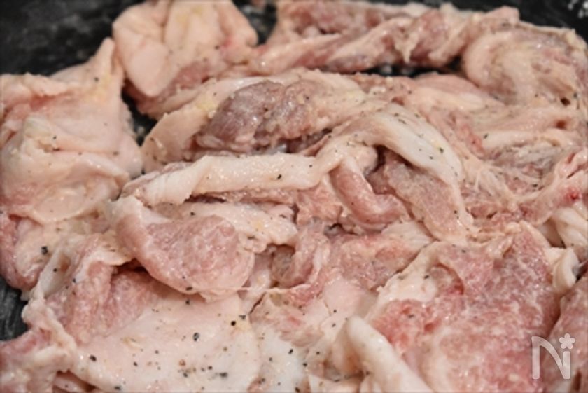(1) フライパンに豚こま切れ肉、【A】を入れてよく混ぜる。