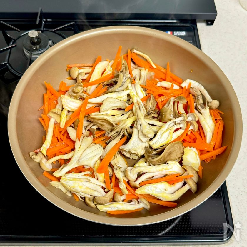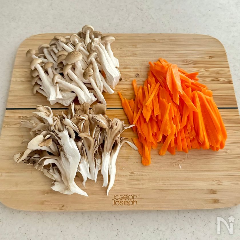 (1) 人参は皮を剥いて、太めのせん切りにする。しめじと舞茸は小房に分ける。