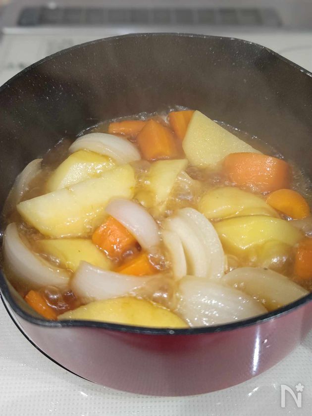 水を加え、沸騰したら強火で3分煮る。