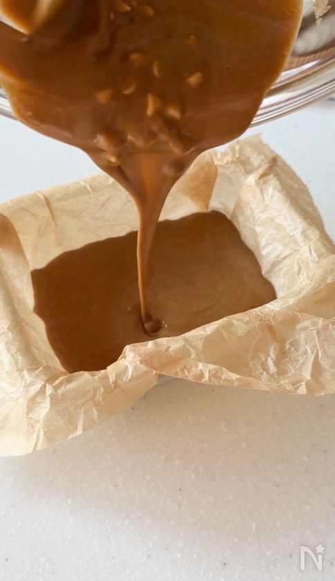 (3) 耐熱容器にクッキングシートをしき、生地を流し入れる。