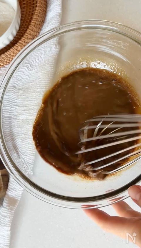 (1) ボウルに【B】と溶かしたインスタントコーヒーを入れて、ホイッパーでよく混ぜる。