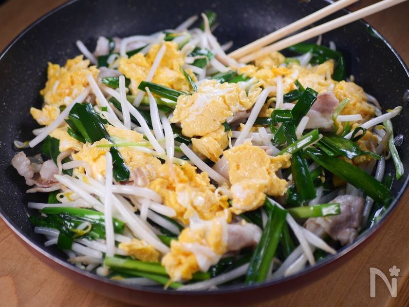 (3) 続けてフライパンにサラダ油(大さじ1)を中火で熱し、豚肉を炒めて火を通したら、ニラともやしを加え強火にしてさっと炒める。