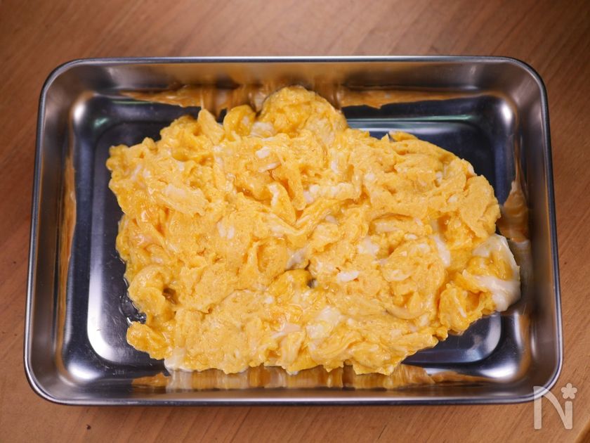 (2) フライパンにサラダ油(大さじ1)を強めの中火で熱し、卵を軽く溶いて入れ、箸で混ぜて半熟のスクランブルエッグを作り、いったん取り出す。