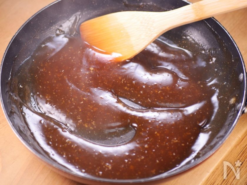 (4) 最後に混ぜ合わせておいた調味料をフライパンに入れ、木べらで混ぜてとろみを付け、具の上からかける。