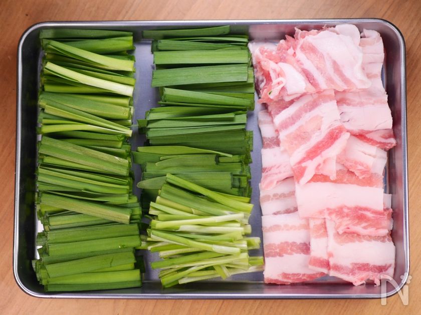 ・ニラは5cmのざく切り(根元の太い部分はさらに縦半分に切る)
