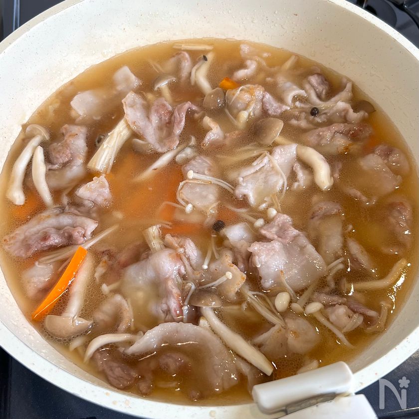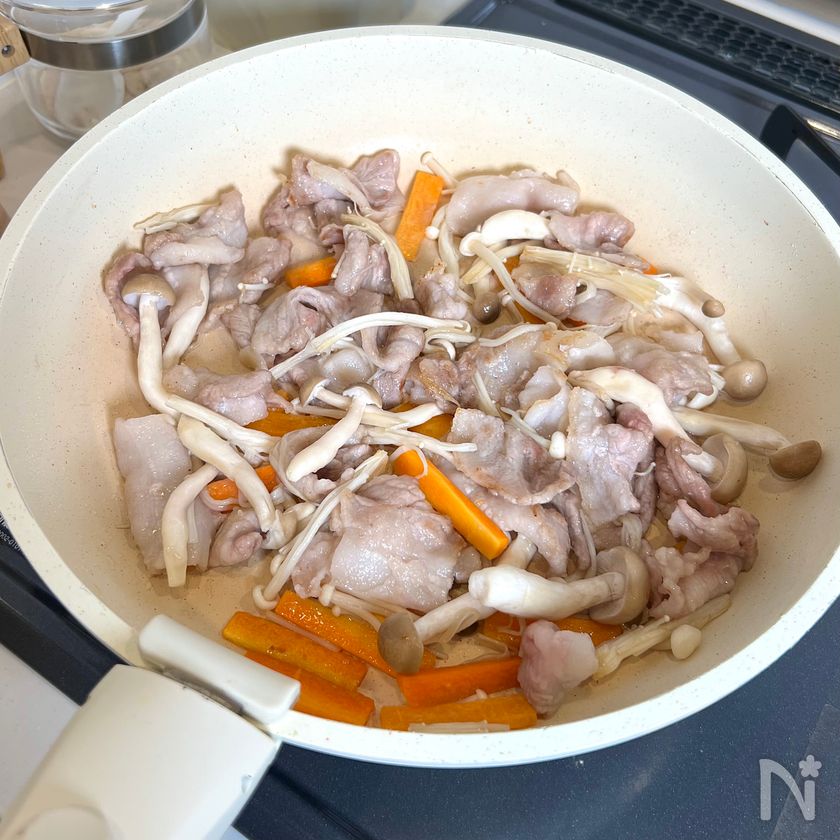 豚肉の色が変わってきたら、えのきとしめじも加えてさっと炒める。
