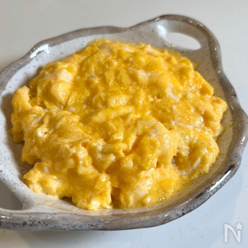 (3) フライパンにサラダ油を入れ中火で熱し、卵液の半量を流し入れる。半熟状になったら温かいご飯にのせる。