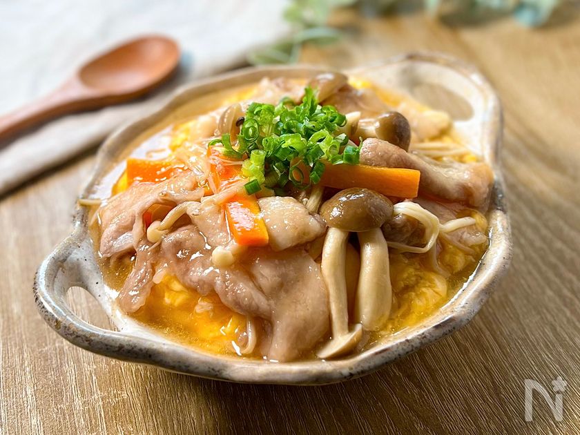 ワンパンで作る!【豚肉ときのこのとろたま和風丼】
