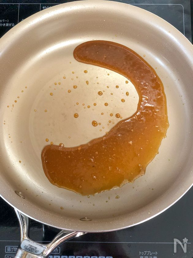 【B】を入れて、弱火で加熱しながら混ぜ合わせる(1〜2分)。