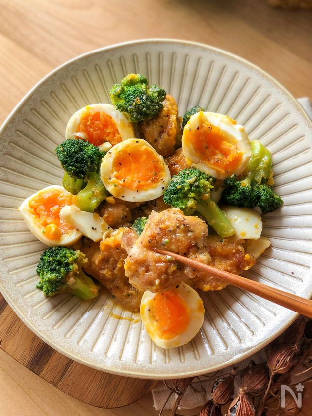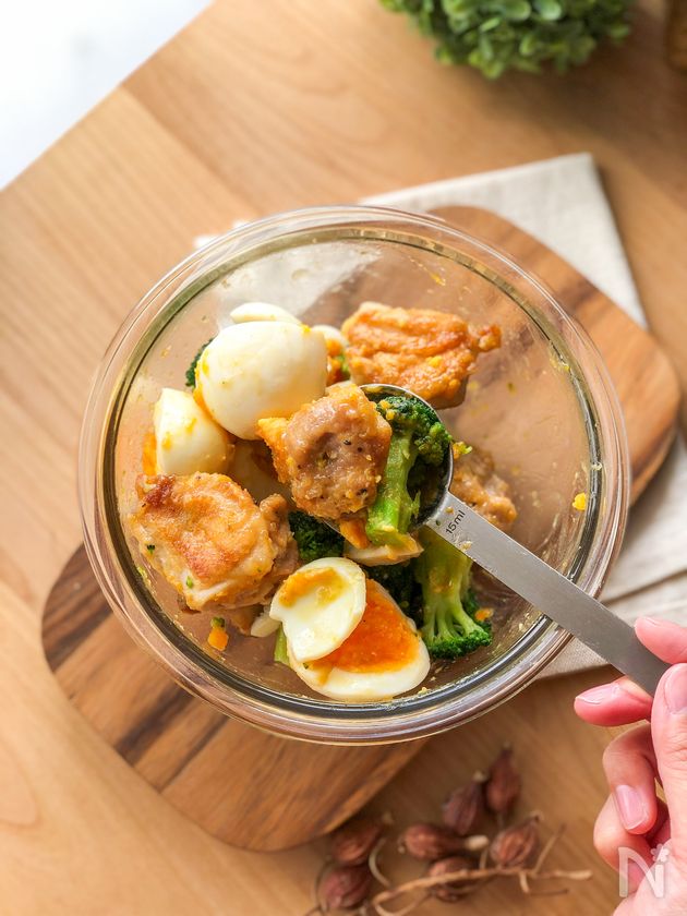 (3) 鶏もも肉を入れたボウルに、ゆで卵とブロッコリー、2のタレを加える。スプーンなどで全体を混ぜ合わせる。