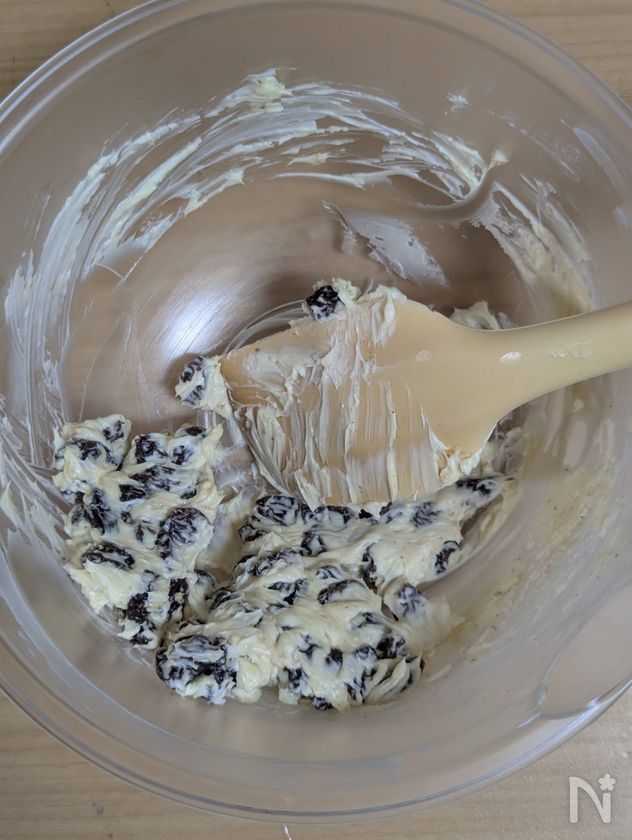 (1) 無塩バターとクリームチーズをよく練り、レーズンを入れて混ぜる。いったん冷やす。