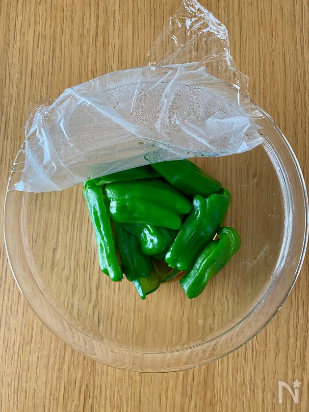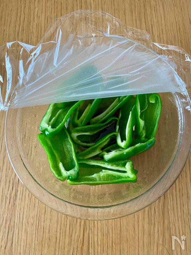 (1) ピーマンの向きを変え、ボウルの下の方にあるピーマンを上にうつして再びふんわりラップし、600Wのレンジで2分加熱する。
