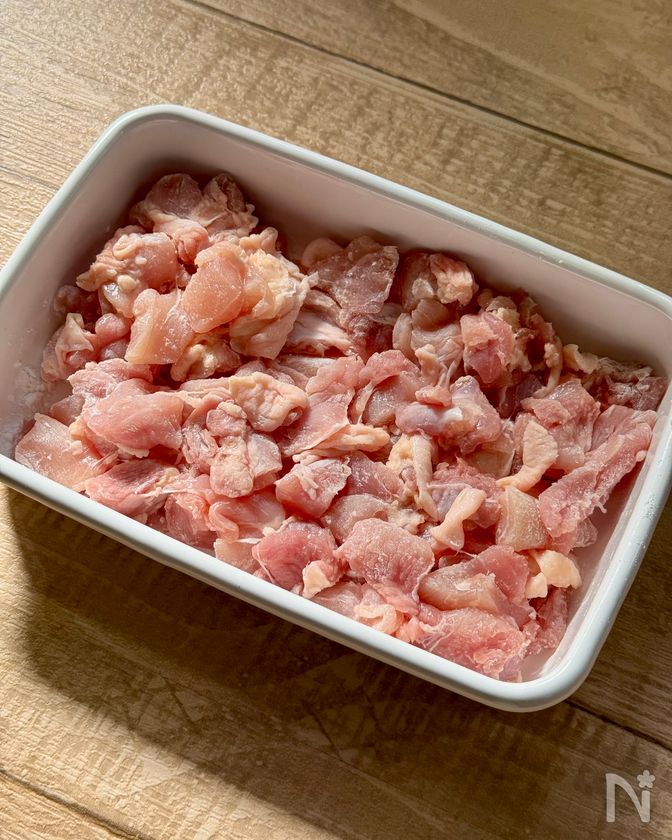 (下準備) 鶏もも肉は余分な脂を取り除き、小さめのひと口大に切る。塩、こしょうをふって下味をつけ、全体に片栗粉をまぶす。