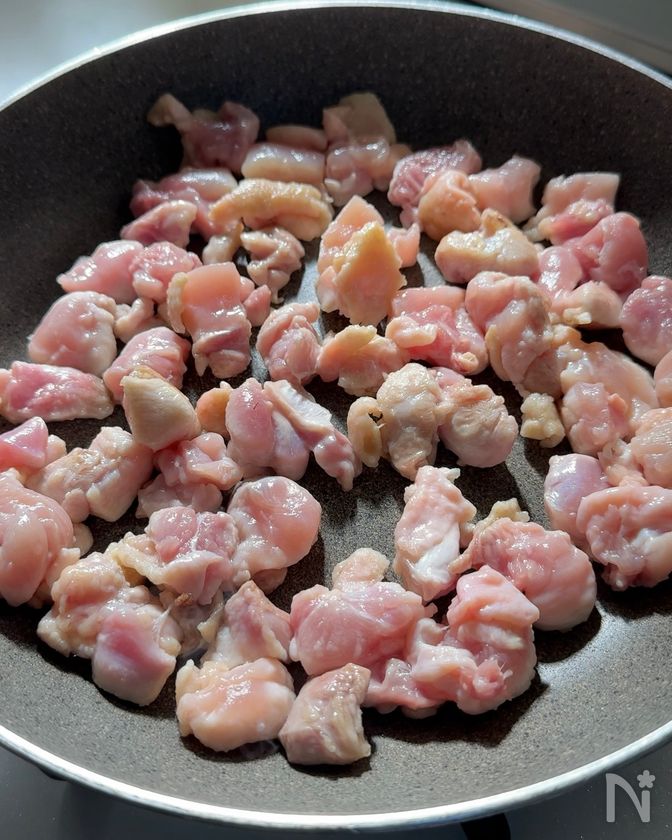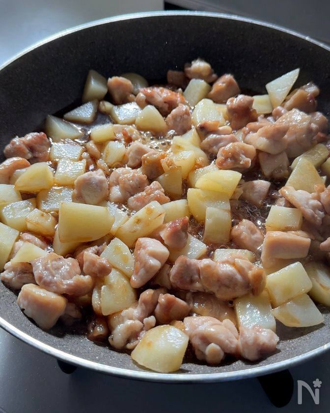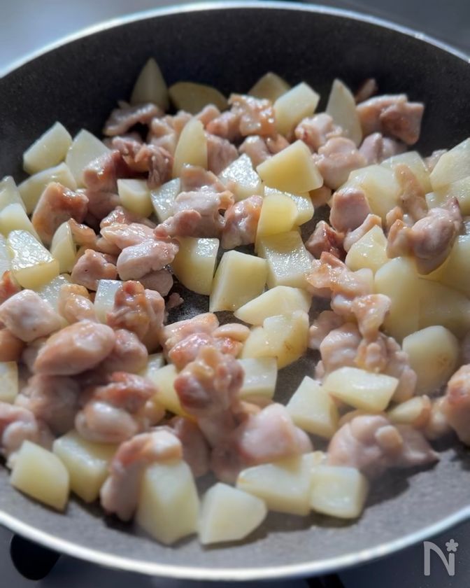 (3) 鶏肉に焼き色がついたらじゃがいもを加え、全体を軽く混ぜながら2〜3分ほど焼く。