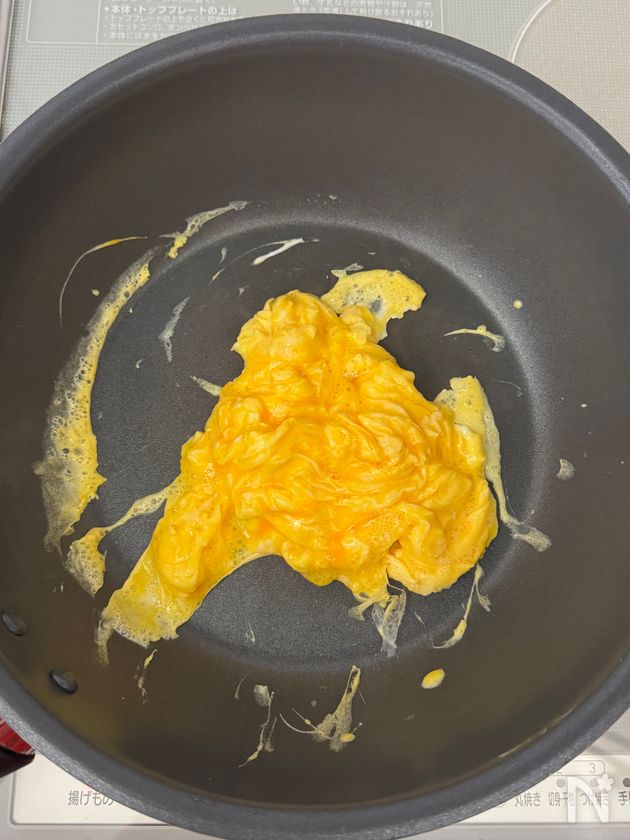 (2) フライパンに、炒め油小さじ1を引き、しっかり温める。溶いた卵を入れ、真ん中に集めるように、半熟に炒める。1度取り出す。