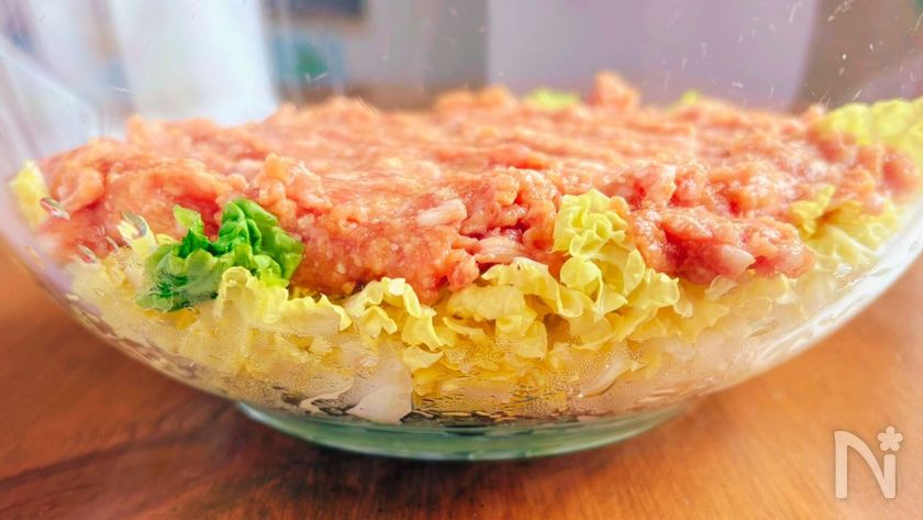 (3) ①で加熱した白菜の上に、②を平たく広げてのせる。