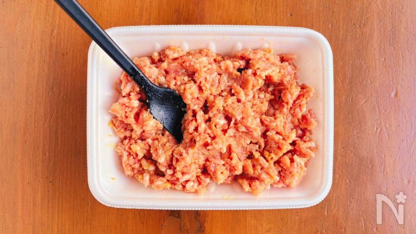 (2) 豚ひき肉のトレーに【A】を加えて、混ぜあわせる(トレー内で混ぜれば洗い物を減らせる)。