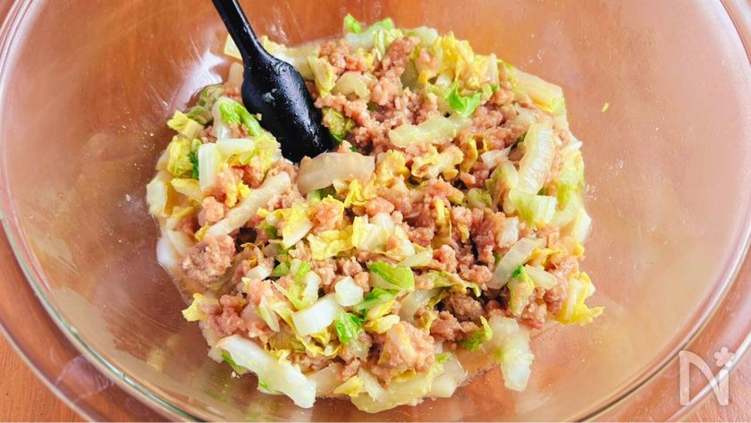 「作り方1」の時に、白菜をキッチンペーパー等で押さえるなどして、しっかりと絞るようにして水分を切ると、完成後に水っぽくなりにくくなります。