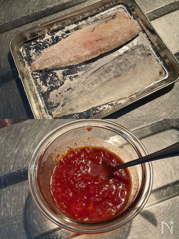 (1) 骨取り塩サバは表面の水分をキッチンペーパーで拭き取り、片栗粉をまぶす。【A】は混ぜ合わせておく。