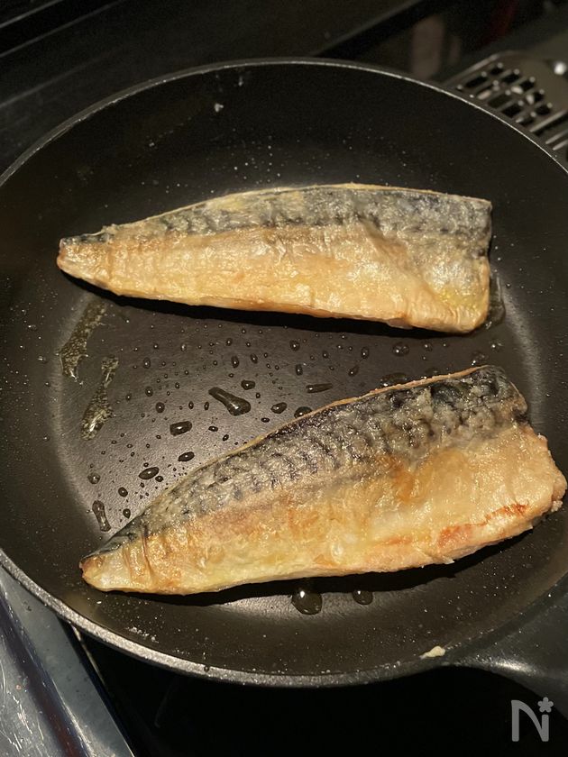 ・サバの表面についた水分は臭みの原因になることがあるため拭き取ります。また、皮目から焼くと、焼き縮みによる破れを防ぎ、見た目もキレイな仕上がりになります。