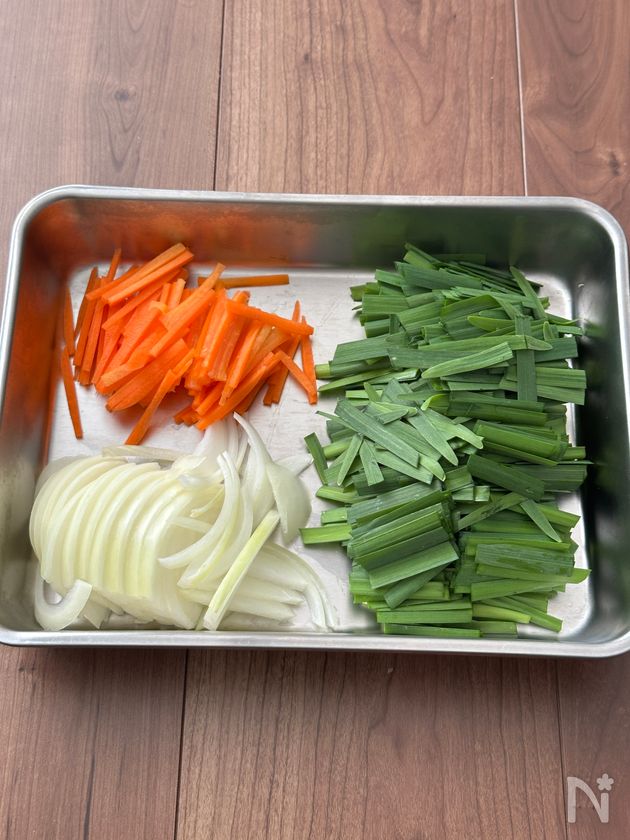 (2) ニラは4cm幅、人参は細切り、玉ねぎは7mm幅に切る。