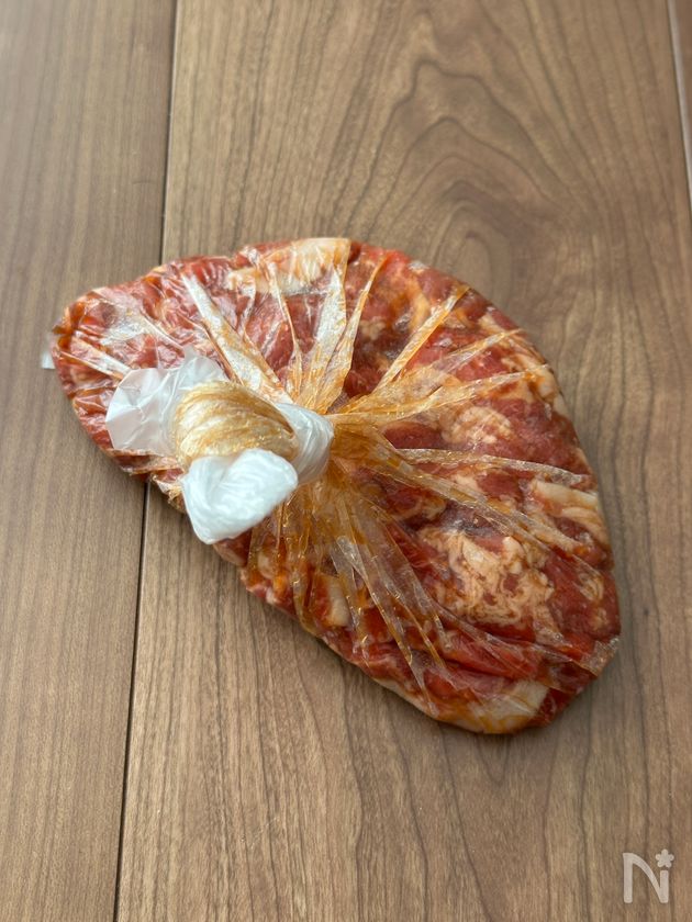 (1) ポリ袋に牛肉薄切りと【A】を入れてよく揉んでおく。