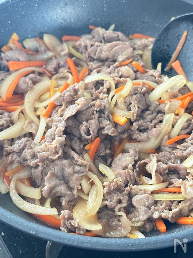 軽く火が通ったら切った人参、玉ねぎを入れて玉ねぎがしんなりするまで炒める。