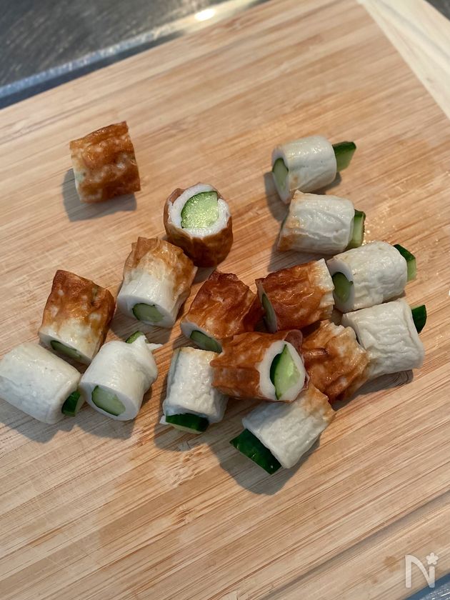 (1) きゅうりは縦4等分に切り、ちくわの穴に詰めて4等分に切る。
