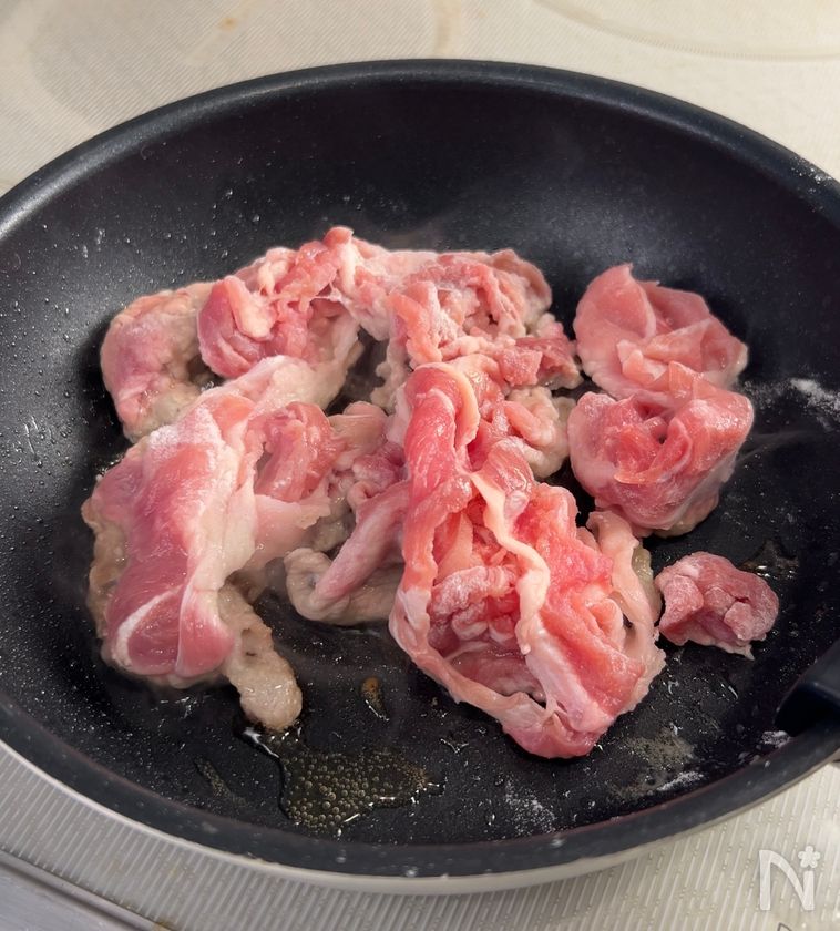 (1) フライパンにごま油をひき、中火で豚肉を焼く