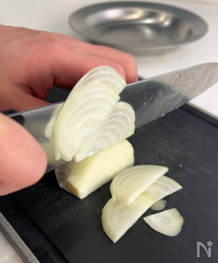 (下準備) 玉ねぎは薄切り、にらは2cm幅に切る。