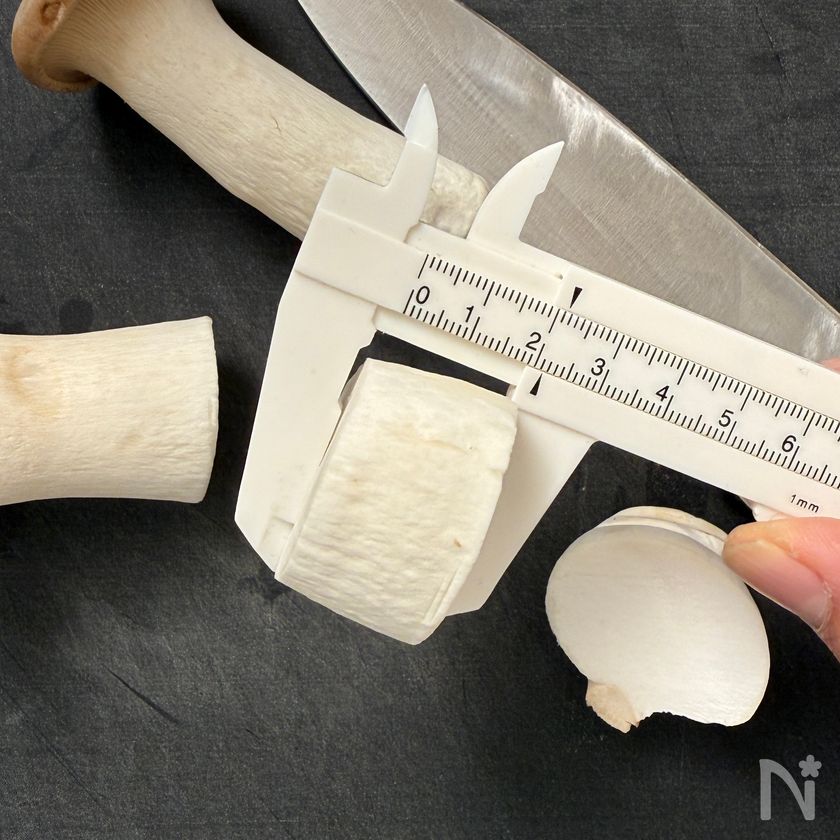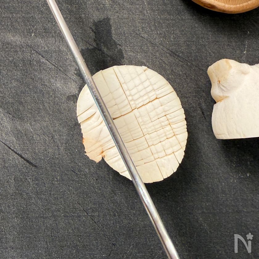(1) エリンギの片面に包丁で格子状の切り込みを入れる。