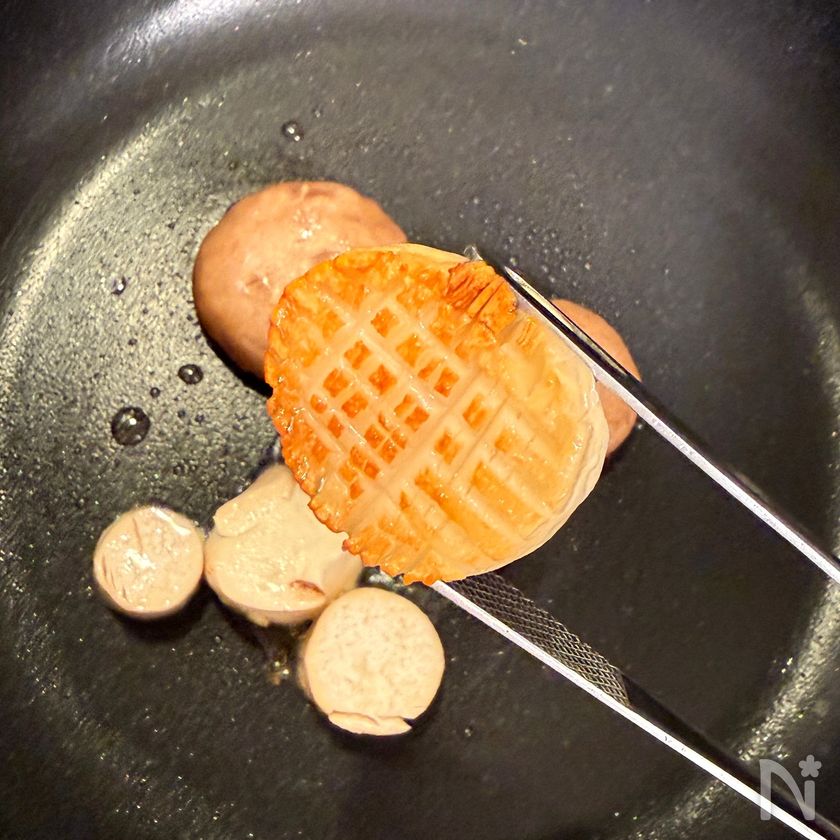 (3) フライパンにサラダ油をひいて、エリンギの切り込みを入れた面を下にして強火で加熱。焼き目がついたら裏返し、火を止めて1分放置。