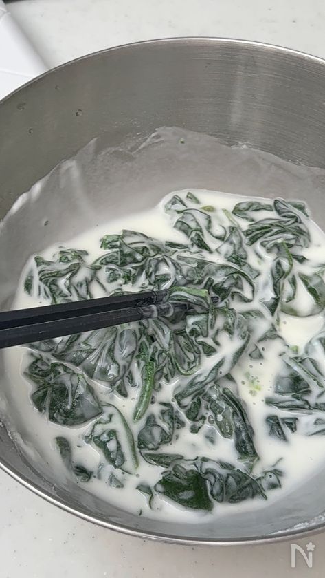 (2) ボールに【A】、水150mlを入れて混ぜ、ほうれん草を加えて混ぜる。