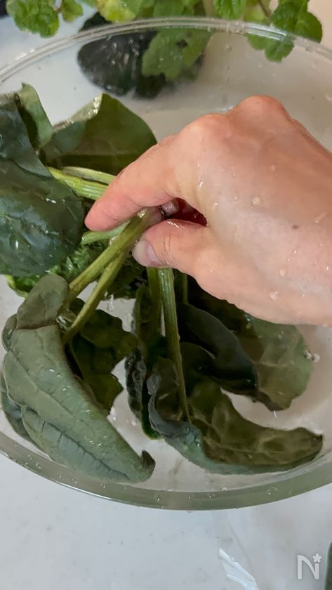 (下準備) ちぢみほうれん草はよく水で洗う。