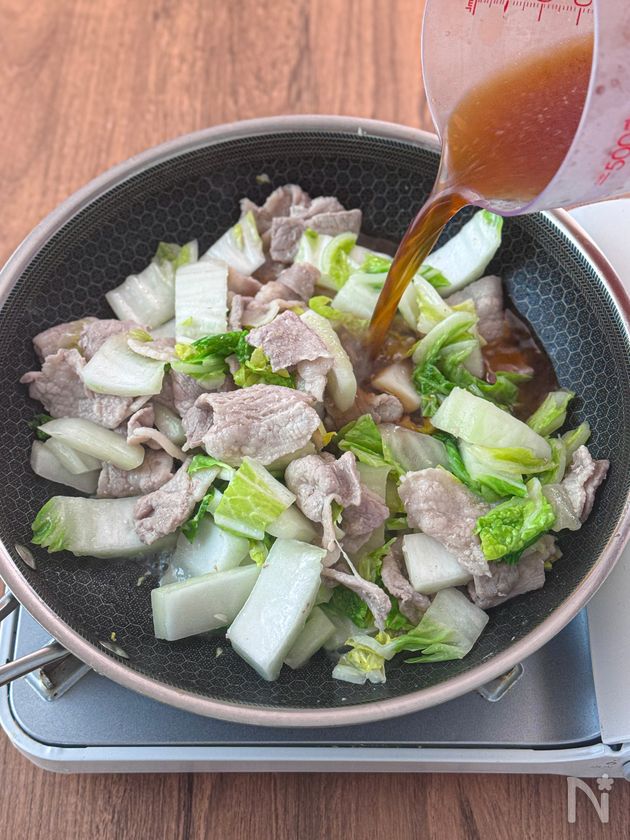 肉の色が変わってきたら白菜を加え、しんなりとするまで炒める。