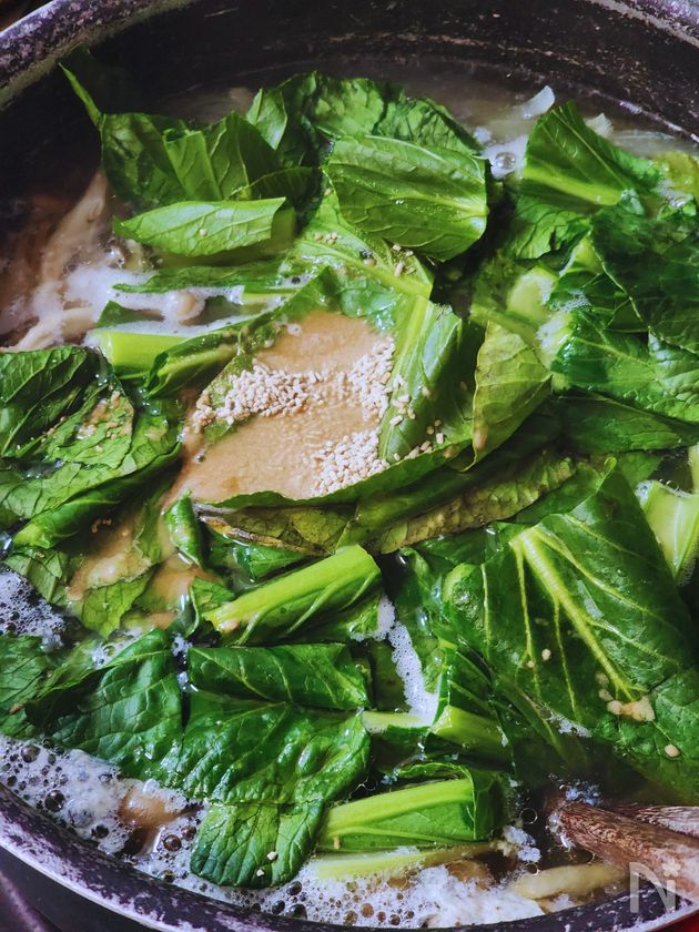 綺麗な緑を見せたいので、カレールウを入れたあとに追い小松菜を入れてから5分ほど煮込んでください♪