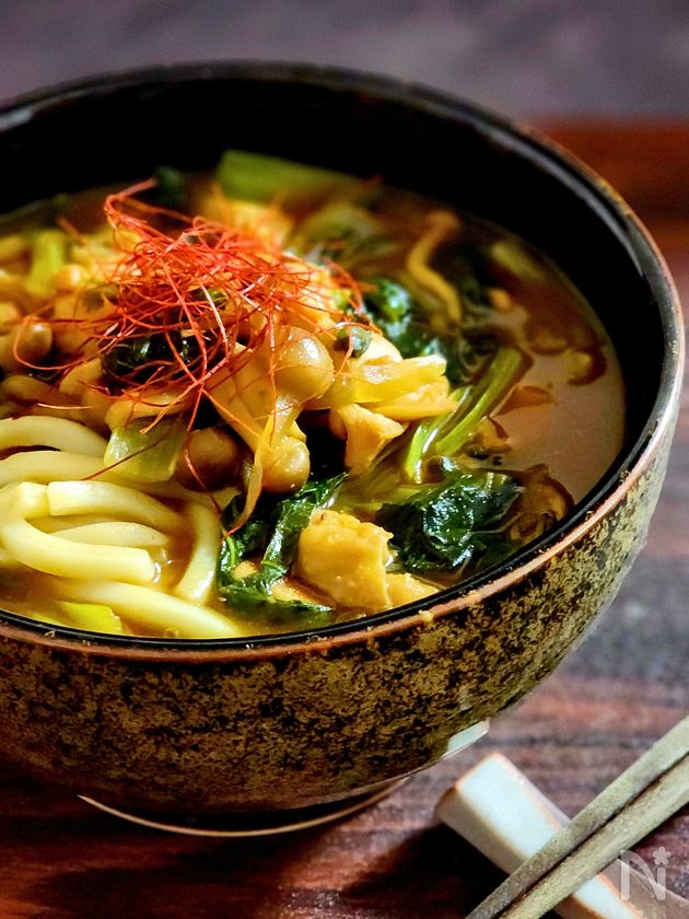 (6) 温めたうどんにかけて、お好みで一味唐辛子や糸唐辛子をのせて完成。