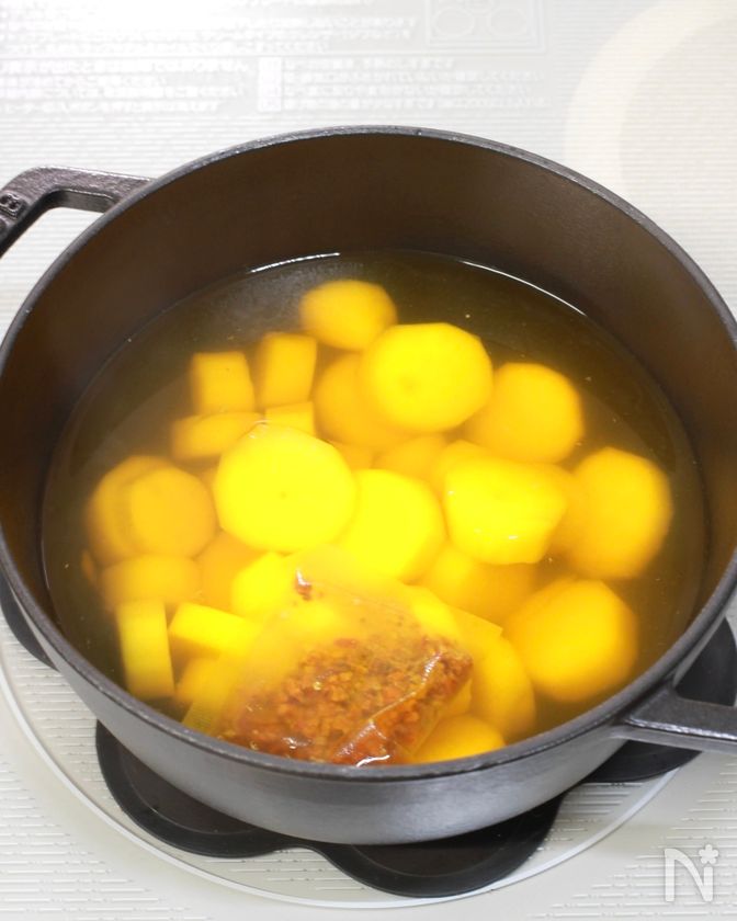 (2) 鍋に①と、くちなしの実(潰してティーパックに入れたもの)を入れ、たっぷりの水を加え火にかける。