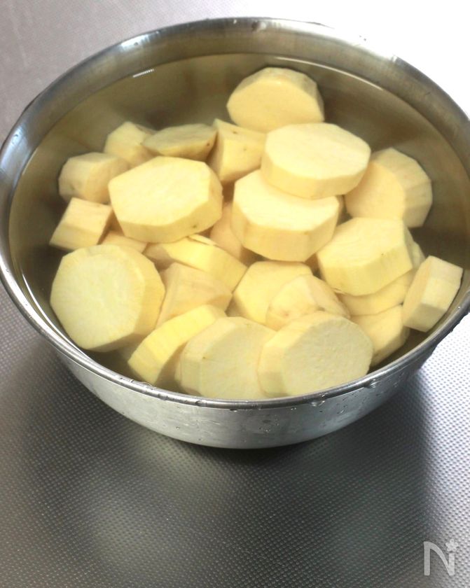 (1) さつまいもは1cm厚さの輪切りにし、5分ほど水にさらして水を切る。