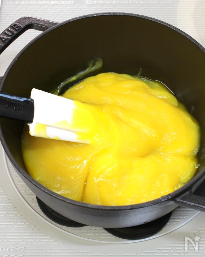 (4) 中弱火〜弱火で滑らかになるまで練ったら取り出し、栗甘露煮を乗せる。